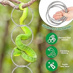 Versatile 6-Direction Climbing Maze: Our enrichment for ball pythons interlocking 6-ring design creates multiple weaving paths (26" total length), encouraging natural exploration and muscle development for snakes up to 5ft ---providing them with more climbing opportunities Ultra-Safe Rounded Design: The snake rings for ball python is made of smooth round stainless steel (4.5 inches in diameter) with reinforced joints, and comes with 2 connecting hanging hooks and a 5-meter faux vine decoration. Hassle-Free Installation: Includes hanging hooks that securely attach to mesh lids. Wrap the faux vine decoration around the climbing ring for added friction and decoration, safe for long-term hanging use, letting pets explore on their schedule! Customizable Difficulty Levels: Snake enrichment rings can be builded 26" extended tunnels or create vertical challenges. Adjust the configuration weekly to stimulate your pet snake's hunting instincts. Wide Application: Snake climbing accessories Perfect for ball pythons, bearded dragons, chameleons, and more! The modular system is suitable for snakes, lizards, and even small parrots – perfect for bioactive terrarium.