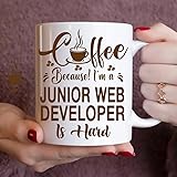 [Humorous Gift for Junior Web Developer Professionals]: This 11oz white ceramic mug features the funny quote: Coffee, Because! I'm a Junior Web Developer Is Hard, perfect for Junior Web Developer who rely on coffee to power through their challenging days. [Durable Ceramic Design]: Crafted from premium white ceramic, this 11oz mug is microwave-safe and dishwasher-safe, perfect for daily coffee or tea in any workplace. [Comfortable Size For Workdays]: With an 11oz capacity, this mug fits seamlessly in an office or home setting, designed with a sturdy handle for Junior Web Developer enthusiasts. [Perfect Gift for Any Occasion]: Surprise your favorite Junior Web Developer with this personalized mug on birthdays, holidays, or as a thoughtful appreciation gift. It’s a great way to celebrate their hard work and dedication! [Ideal Size for Coffee Lovers]: With an 11oz capacity, this mug is the perfect size for coffee, tea, or any beverage, making it for any Junior Web Developer needing a caffeine boost during their busy schedule.