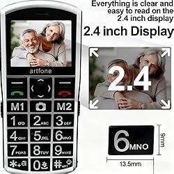 【Versatile Connectivity】supports 2G, 3G and 4G LTE networks, allowing you to stay connected wherever you go, compatible with T-mobile and it's virtual operators ONLY, NOT work with AT&T or Verizon. This phone is unlocked, but it is not compatible with locked SIM cards, such as government subsidized cards with free monthly plans. If you have questions about carrier compatibility before purchase, please contact us 【User-Friendly Unlocked Phone with Big Buttons】The artfone A400, featuring a UI operating system, is a large-key senior phone with a raised backlit keypad designed to meet the tactile needs of the elderly. The prominent red and green buttons make dialing and texting easier, reducing errors. This keypad phone is a no-contract device that does not support internet browsing. Beyond basic functions like alarms and radio, it is exclusively designed for calls and SMS 【Safety First, 2MP Camera Captures Precious Moments】While delivering an exceptional user experience, Artfone's 4G phone prioritizes user safety with an SOS button on the back. In emergencies, pressing this button activates a distress signal, automatically dialing five preset emergency numbers and sending a distress SMS until someone answers. The enhanced HD camera allows seniors to capture life's beautiful moments, making the A400 a considerate companion 【Focused on Seniors' Visual and Auditory Experience】This feature phone is equipped with a 2.4-inch LCD high-definition display, offering larger fonts and clearer menu icons to protect seniors' eyesight. The 2030 Box & Stereo speakers provide ultra-high volume, ensuring clearer and more stable calls, a boon for those with hearing impairments 【Worry-Free Battery Life and Convenient Charging Dock】The A400 simple phone uses high-quality materials for its battery, boasting a capacity of 1800mAh, offering 8-10 hours of talk time and nearly a week of standby time on a full charge. It also introduces a new charging dock with battery protection features, ensuring safe and convenient charging for seniors 【Multifunctional Phone with Personalized Contacts】This senior phone supports setting pictures for each contact, facilitating caller ID recognition. It can store up to 1000 contacts and supports audio, video, Bluetooth, FM radio, calculator, alarm, calendar, and more. Multiple alarm settings are particularly useful for seniors who need medication reminders. The physical keyboard and T9 predictive text input ensure fast and accurate texting 【Easy-to-Use Voice Time Announcement and Speed Dial】The artfone senior mobile phone features a unique one-button time announcement function, activated by holding the volume + key for 3 seconds to announce the current time. Dedicated M1/M2/*/# keys and numbers 2-9 enable speed dialing, allowing quick access to frequently contacted individuals without the hassle of manual input 【Phone Keyboard Lock Function】Sliding the side key on the right locks the screen and buttons with one tap, completely preventing accidental touches in your pocket. This stops embarrassing calls, unintended message sends, and personal privacy leaks. This simple action not only effectively saves power and extends battery life, but also allows elderly users with limited dexterity to ensure the phone is only activated when needed