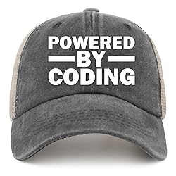 POWERED BY CODING Hat Trucker Hat Men Funny Mesh Hat for Men and Women Breathable Cap for Summer, Funny Trucker Hat Washed Denim Hats Unisex Snapback Adjustable Hat Pull on this novelty trucker hat to bring your friends and family amazing fun and joy. The unique POWERED BY CODING design can make your friends feel nice once they see you. This vintage-style mesh trucker hat is soft and breathable, ideal for both women and men on bad hair days. Suitable for fishing, camping, hiking, climbing, or any outdoor sport, and of course indoor exercise or daily use. Redefine your fashion experience with a retro-style trucker hat. The back mesh shield design fights odors, and wicks away sweat for comfort through our fast dry functional technology. Adjustable strap - has never been easier to find the perfect size hat for yourself! 【GREAT GIFT】 This would be a great inexpensive yet nice gift for him or her for family and friends on birthdays, holidays, anniversaries, or any celebration! A perfect gift for New Year, Valentine's Day, St. Patrick's Day, Mother's Day, Father's Day, Memorial Day, Independence Day, Patriot Day, Halloween, Veterans, Thanksgiving, and Christmas.