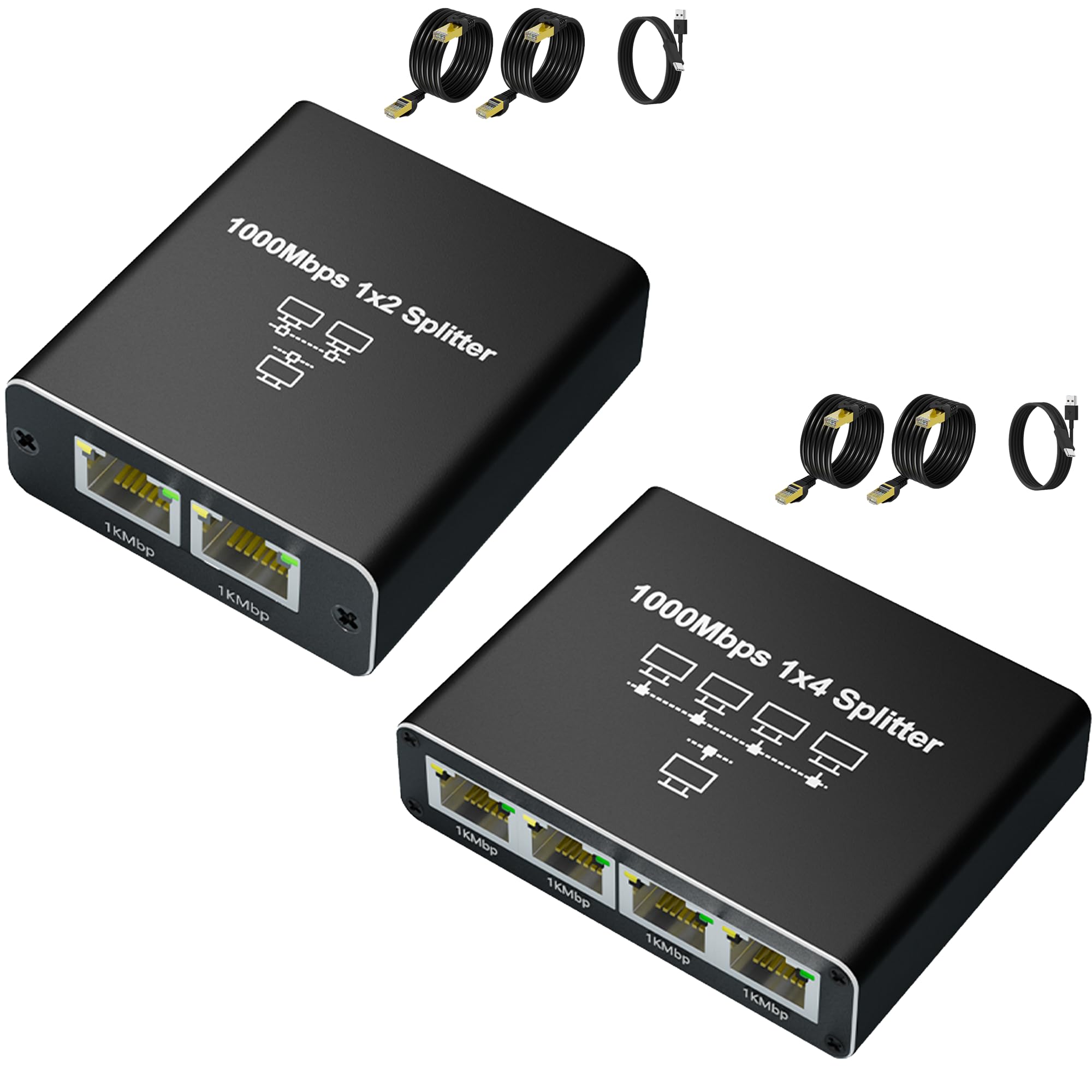 - Easily expand your network with this Gigabit Ethernet Splitter 1 to 4. Designed to convert one RJ45 ethernet port into four simultaneous high-speed ports, this splitter supports up to 1000Mbps transmission. It includes two 6.6FT Cat6 ethernet cable splitters for immediate, reliable setup.The usb powered ethernet adapter guarantees consistent signal strength and uninterrupted data transfer. With an aluminum alloy casing, PCB circuit board, and gold-plated RJ45 connectors, this splitter ensures stable, interference-free performance for all connected devices.Whether for gaming, streaming, or multi-device offices, this ethernet splitter high speed solution connects your router, ethernet switch, PC, NAS, TV, or set-top box without slowdown. LED indicators keep you informed of each active port’s status. Compatible with Cat5/5e/6/7/8 cables, it’s the ideal network expansion for modern setups.