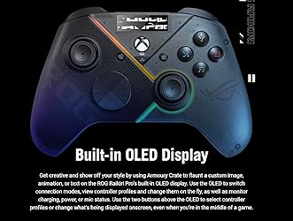 Built-in OLED display: Create a unique look with customizable animations, view status indicators, and switch profile on the fly Versatile tri-mode connectivity: Use low-latency 2.4 GHz RF, Bluetooth, or wired USB-C to play on PC; plus certified for Xbox via USB-C connection Intuitive rear controls: Four left and right buttons can be programmed for in-game commands or for on-the-fly joystick sensitivity shifts Selectable step triggers: Left and right triggers can be set to short- or full-range modes, with dead zones customizable in Armoury Crate Premium sound: Built-in ESS DAC for immersive audio; plus 3.5 mm earphone jack, and a mute button Extensive customization: Remap buttons, change joystick sensitivity, or make other adjustments via Armoury Crate Extensive battery life: Up to 48-hour battery life enables nonstop gaming