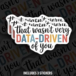 PACK CONTENTS: Set of 3 identical vinyl stickers featuring the humorous text 'That Wasn't Very Data-Driven Of You' in colorful typography design SIZE SPECIFICATIONS: Each sticker measures 3 inches in size, perfect for decorating laptops, water bottles, and phones VERSATILE USE: Ideal for data analysts, programmers, and tech enthusiasts to personalize their devices and accessories with witty tech humor DESIGN FEATURES: Multi-colored text layout with professional finish, featuring playful typography and clean edges APPLICATION SURFACE: Compatible with smooth surfaces including laptops, water bottles, phones, and other personal items for decorative purposes