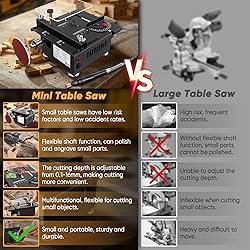 Multi-Functional Table Saw: The mini table saw is a combination of cutting/grinding/carving/drilling. The craft mini table saw is equipped with 4 saw blades of different materials to cut small objects (balsa wood, veneer, PCB, plastic, etc.). Table saw is equipped with a drill chuck with a grinding or polishing head installed on it; it can also be equipped with a flexible shaft to drill or carve objects. Miniature table saw is suitable for hobby crafts, DIY handicrafts, creative research Precision Cutting System: Mini multi-functional table saw has high-precision alloy saw blades and precision guide rails to ensure smooth cuts, providing perfect components for your woodworking splicing and modeling to meet your fine craftsmanship needs Powerful Motor & Adjustable Speed: Portable table saw is equipped with a 100-watt high-power motor with a speed of up to 6000 rpm, which can easily cope with all kinds of small wood cutting, whether it is thin board or hardwood, it can cut quickly and accurately, greatly improving work efficiency. At the same time, it provides seven speeds, which can be adjusted by yourself Adjustable Cutting Depth & Angle:The cutting depth range is 0-16mm, and the blade height can be easily adjusted with the included Allen wrench. Turn clockwise to raise the blade, and counterclockwise to lower it. The cutting angle is adjustable from 0° to 90°, allowing you to adjust the cutting angle to your needs. The mini saw for crafts allows you to experience greater flexibility, being able to process a variety of materials with precision and ease Portable and Compact Design: Small table saw for crafts is a one-piece cast iron body, which is durable and suitable for long-term use. The table saw measures 7.09 in x 6.30 in x 4.33 in. It is compact and portable, allowing you to easily move and store it in different work sites, and start woodworking creation anytime, anywhere Safety Protection: Craft table saw mini is equipped with a transparent baffle to effectively block the splashing of wood chips and ensure your safety during operation. At the same time, the bottom corners are equipped with non-slip and shock-absorbing rubber feet to prevent displacement during operation Note: This mini table saw is not suitable for cutting materials that are too large, too wide, and too thick. It is easy to get stuck and overload. Maximum cutting depth:0.591in. Please be careful not to feed the material too fast. Otherwise, the saw blade will get stuck, causing the table saw to fail to work