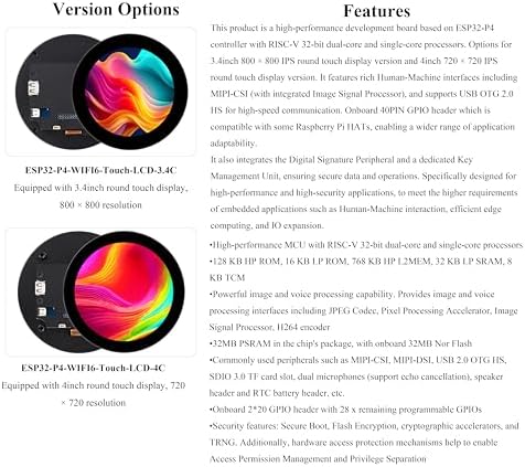 ESP32-P4 3.4 inch Round Touch Display Development Board, IPS LCD, 800x800 Resolution, Support WFi 6 / BLE 5,Onboard Dual Microphones, Audio Input/Output, Supports AI Voice Interaction
