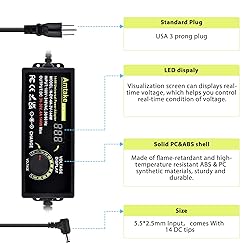 Adjustable Voltage Power Adapter Input: Input AC 100-240V, 50/60Hz; Output DC 3-24V adjustable ; It can supply with amps less than 4A, such as 300mA, 500mA,1A, 1.5A, 2A, 2.5A, 3A,4A. Complete 14 Tips Set: Includes an original 5.5x2.5mm tip and 14pcs frequently used tips. You can screw wires onto it easily, perfect for DIY projects. Please carefully check the tips dimension and confirm whether it match with your device. Universal Power Supply:Features a rotatable knob for precise voltage adjustment, LED display for real-time monitoring, and an independent power switch. Widely Used:The power supply adjustable adapter AC/DC adapter fit for many 3~24V small household electronics such as LED strips, under-cabinet light, TV Box, smart speaks, wireless routers, essential oil diffuser humidifier, USB fan, Wifi camera, USB Hub, hard disk box etc. Note:Please choose correct voltage and the wrong voltage may damage your device. It recommend to use less than 80% of the full load.If you have any questions,please feel free to contact us through Amazon, we will solve it asap.