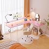 Pamray 64 Inch L Shaped Gaming Desk with Power Outlets and Led Lights, Large Corner Computer Desk with Monitor Stand and Pegboard, PC Table for Home Office and Bedroom Pink