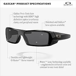 - Experience Oakley's OO9014 Gascan rectangular sunglasses, designed for those who demand both performance and everyday versatility. These rectangular frame sunglasses bring together sharp angles and straight edges with design technology as aggressive as its styling. The lightweight O-Matter frame construction delivers all-day comfort and durability, while the distinctive curved geometry provides protection for active lifestyles. These unisex sunglasses feature Plutonite lenses that filter 100% of harmful UVA, UVB, and UVC rays with impact resistance. Available with a range of lens technologies including standard grey for everyday comfort, polarized options for glare reduction, and Prizm lenses engineered to enhance color and contrast for superior detail recognition. Perfect for sports, cycling, fishing, driving, hiking, and outdoor adventures. Whether you're hitting the beach, playing golf, or travel, the Gascan's tactical design makes them ideal for all active pursuits. These designer performance sunglasses combine cool styling with scratch-resistant durability. Click on the Oakley link above the product title to shop the entire Oakley sunglass and eyeglass assortment.