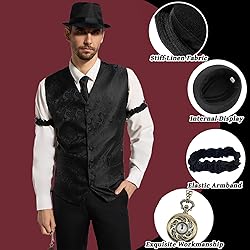 【1920s Accessories Set】: You will get our 1920s men's accessories pack including hat*1, pre tied bow tie*1, tie*1, pocket watch*1, suspenders*1, armband*2. All of which are items with strong retro elements, very suitable for all kinds of retro gentleman looks. This is the perfect complement to your outfit, making every appearance stand out. Enjoy the fun with this 1920s accessories set! 【Carefully Selected Materials】: Roaring retro accessories set is made of premium materials. The classic hat is made of high-quality polyester fiber, soft, comfortable, elastic, light and breathable, which is very suitable for daily wear and important occasions. The beard is made of chemical fibers, with a true plush feel and smooth touch. This 1920 men's suit combines comfort and style, making it the perfect choice for attending parties. 【Enter the Retro 1920s】: 1920s men vest accessories set is inspired by the popular style of the 1920s. A retro hat and bow tie, and classic gold pocket watch, can instantly transport you back to the roaring 20s and become a stylish gentleman. You can use your imagination to interact with friends and family, and our 1920 accessories give you a more immersive experience. 【Versatile Occasion Outfit】: Retro gangster costume set is very suitable for World Book Day, cosplay activities, carnival celebrations, stage performances, birthday parties, theme parties and other occasions, and can bring unexpected surprise effects. You can use them to match different themed parties or everyday outfits, making you stand out in every appearance. You can also dress up with your family and friends, increase the fun of the party, and shine brightly at the party. 【Great 1920s Fan Gifts】: Gatsby gangster costume accessories set comes in one size, wihch can be worn comfortably by most people. Don't miss our great 1920's clothing accessories set. Transform into a charming vintage gentleman and show off your unique style and confidence in this charming outfit.