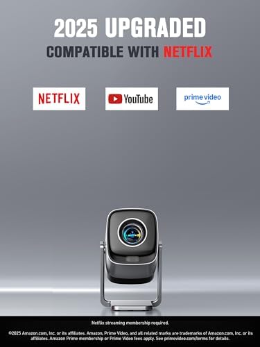 - [Compatible with Netflix, Instant Access to Global Entertainment] The smart projector Compatible with Netflix & comes preloaded with multiple streaming apps that unlock a library of over a million movies or shows, with constantly updated content that is secure and stable. Imagine a quiet evening with beam of light pouring gently from projector, instantly transforming the wall into theater screen. Whether it’s a thriller or a rom-com.