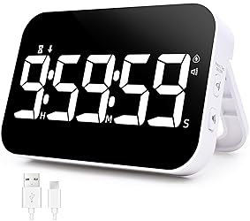 RECHARGEABLE LED DISPLAY TIMER: Our kitchen timer doesn't need additional batteries, the built-in battery supports Type-C charging (charging cable included in the package). Big and bold digits and clear large 5" LED display timer can work for at least 5 hours in Hight light mode. When the battery is low, a low battery indicator will be displayed in the upper right corner. Great for kids and seniors, you can easily make it work too MULTIPLE PLACEMENT COOKING TIMER: The digital kitchen timer for cooking with 4 strong magnets on the back, it can be easily attached directly to the refrigerator and any other metal surface, you hang it anywhere by using the hook, the magnetic timer is also equipped with a bracket on the back, push the bracket on the back two times consecutively until you hear a click and the bracket opens up completely you can put it anywhere you want 2-LEVEL BRIGHTNESS & POWER SAVING MODE: The timer with high and low brightness and energy-saving mode adjustment, you can choose the brightness mode according to different use scenarios (Note: energy-saving mode enters the sleep state after 10 seconds) COUNTING DOWN/UP KITCHEN TIMER: The large digital timer countdown from 9:59:59 to 0:00:00, or as a stopwatch from 0:00:00 to 9:59:59, When the timer count down is over, press the ST/SP button and return to the last set time. Perfect for a variety of uses such as a kitchen cooking timer, classroom timer, workout timer, egg timer, gym timer, yoga timer, study session timer, or meditation timer MAGNETIC TIMER EASY TO USE- The visual timer for classroom with simple button settings, children and seniors can make it easily for work! Separate H, M and S buttons set the exact time you need, SP/ST buttons start/stop, a CLEAR button is added to make it easier to reset. Press and hold the H, M or S to quickly adjust to the time you want. When the countdown starts, press any of the top buttons to pause, then press the ST/SP button to return to the last set time