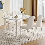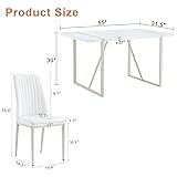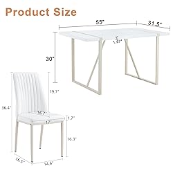 White Dining Table Set for 4:This rectanglular dining room table set offers a generous surface area for 4-6 to enjoy meal or party, 55''x 31.5''x 30''. Thanks to the simple and sophisticate design, this white kitchen table set enough to complement a variety of interior styles Rectangle Dining Table:Max load top of the table up to 300 lbs. Features a engineered wood table top and metal brackets, making this cream white dining table set cater for the needs of big family lunch or party. The bottom of each base is equipped with non-slip mat, avoiding the floor from being scratched Comfy Dining Chairs:The faux leather chair is wrapped with high elastic sponge. The surface is resistant to wear, food penetration and easy to maintain.They feature a creamy finish that matches the table, as well as a sturdy build that provides both comfort and support. Maximum load capacity 300 lbs Modern dining table set:This table and chairs set of 4 is a cohesive combination of modern style. With its unique design, the 5 piece dining table set adds an elegant touch to any dining area, creating the elegent setup for eating or casual gatherings Low Maintain and Easy to Assemble:Good quality material support low maintain. The white dining table set requires install. Installation instruction will be delivered to your address with the products. To ensure your safety, we recommend at least two people work together on the dining room table set for 4