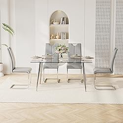 Modern 4-Person Glass Dining Set: Features a sleek 51-inch rectangular glass table and 4 PU leather chairs. This minimalist design complements any interior, ideal for both spacious homes and compact apartments. Mid-Century Modern Dining Table Set: Dining Table Accommodates 4-6 comfortably. Features classic S-shaped armless dining chairs crafted with durable PU leather seats, supportive metal frames, and foam cushioning for lasting comfort and style. Rectangle Modern Kitchen Table :The glass dining table featured the tempered glass table top and supported by metal legs ,not only durable and stable for using ,but also simple design save more space for your apartment. Modern Armless Dining Chairs:The dining chairs featured high backrest which based on ergonomic standard and human body features, comfortable and elegant.The PU leather surface waterproof and easy to clean. Filled with soft sponge offers comfy feeling when you sit on it. The metal frame ensure to it is sturdy and stable Versatile Glass Dining Table Set: This elegant glass dining set isn't just for your dining room. It effortlessly transitions to your kitchen, living room, home office, or even a meeting space.