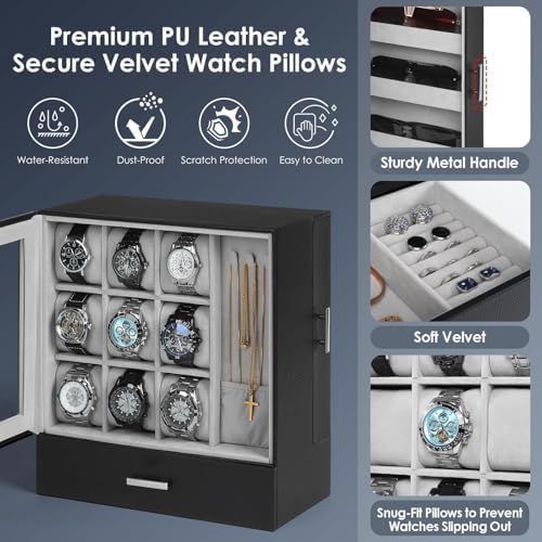 [{"options":[{"sku":"B0DX2GHFXL","option_code":"0","image":"https:\/\/m.media-amazon.com\/images\/I\/41CjxGTK7BL._SS64_.jpg","cloudfront_image":"https:\/\/m.media-amazon.com\/images\/I\/41CjxGTK7BL._UXTMWIDTH_UYTMHEIGHT_.jpg","label":"Black-12 Slot","selected":false,"available":true,"images":[{"alt":"","src":"https:\/\/m.media-amazon.com\/images\/I\/71ekfBweoWL._AC_SR100,100_.jpg"},{"alt":"","src":"https:\/\/m.media-amazon.com\/images\/I\/61Y0aFIowvL._AC_SR100,100_.jpg"},{"alt":"","src":"https:\/\/m.media-amazon.com\/images\/I\/71mJACB4ZbL._AC_SR100,100_.jpg"},{"alt":"","src":"https:\/\/m.media-amazon.com\/images\/I\/71YynFXhWNL._AC_SR100,100_.jpg"},{"alt":"","src":"https:\/\/m.media-amazon.com\/images\/I\/71X02sxlTsL._AC_SR100,100_.jpg"},{"alt":"","src":"https:\/\/m.media-amazon.com\/images\/I\/81KpbooMb1L._AC_SR100,100_.jpg"},{"alt":"","src":"https:\/\/m.media-amazon.com\/images\/I\/71k6G8FI+jL._AC_SR100,100_.jpg"}],"delivery_data":{"fulfill_by":"","sold_by":"","vendor_delivery_day":""},"availability":{"stock":true}},{"sku":"B0FLDSTD6L","option_code":"1","image":"https:\/\/m.media-amazon.com\/images\/I\/51UJXZoU2RL._SS64_.jpg","cloudfront_image":"https:\/\/m.media-amazon.com\/images\/I\/51UJXZoU2RL._UXTMWIDTH_UYTMHEIGHT_.jpg","label":"Black-20 Slot","selected":false,"available":true,"images":[{"alt":"","src":"https:\/\/m.media-amazon.com\/images\/I\/71PoCZmPSlL._AC_SR100,100_.jpg"},{"alt":"","src":"https:\/\/m.media-amazon.com\/images\/I\/711Mo-Dlc4L._AC_SR100,100_.jpg"},{"alt":"","src":"https:\/\/m.media-amazon.com\/images\/I\/71QJTiejjGL._AC_SR100,100_.jpg"},{"alt":"","src":"https:\/\/m.media-amazon.com\/images\/I\/61iHBXerxhL._AC_SR100,100_.jpg"},{"alt":"","src":"https:\/\/m.media-amazon.com\/images\/I\/719-ZUG-MrL._AC_SR100,100_.jpg"},{"alt":"","src":"https:\/\/m.media-amazon.com\/images\/I\/718kW85LfSL._AC_SR100,100_.jpg"},{"alt":"","src":"https:\/\/m.media-amazon.com\/images\/I\/71y3j8NUojL._AC_SR100,100_.jpg"}],"delivery_data":{"fulfill_by":"","sold_by":"","vendor_delivery_day":""},"availability":{"stock":true}},{"sku":"B0DD6KPKZW","option_code":"2","image":"https:\/\/m.media-amazon.com\/images\/I\/41Unf7CLSuL._SS64_.jpg","cloudfront_image":"https:\/\/m.media-amazon.com\/images\/I\/41Unf7CLSuL._UXTMWIDTH_UYTMHEIGHT_.jpg","label":"Black-6 Slot","selected":false,"available":true,"images":[{"alt":"","src":"https:\/\/m.media-amazon.com\/images\/I\/71FO7Zo-qBL._AC_SR100,100_.jpg"},{"alt":"","src":"https:\/\/m.media-amazon.com\/images\/I\/71-CVMSkQYL._AC_SR100,100_.jpg"},{"alt":"","src":"https:\/\/m.media-amazon.com\/images\/I\/71sLpNlk6mL._AC_SR100,100_.jpg"},{"alt":"","src":"https:\/\/m.media-amazon.com\/images\/I\/71vxYO1gwRL._AC_SR100,100_.jpg"},{"alt":"","src":"https:\/\/m.media-amazon.com\/images\/I\/91KIL8HDLCL._AC_SR100,100_.jpg"},{"alt":"","src":"https:\/\/m.media-amazon.com\/images\/I\/61DF13XnwLL._AC_SR100,100_.jpg"},{"alt":"","src":"https:\/\/m.media-amazon.com\/images\/I\/715Ou7SbTXL._AC_SR100,100_.jpg"}],"delivery_data":{"fulfill_by":"","sold_by":"","vendor_delivery_day":""},"availability":{"stock":true}},{"sku":"B0F8Q3J7LF","option_code":"3","image":"https:\/\/m.media-amazon.com\/images\/I\/41bZ6N94cGL._SS64_.jpg","cloudfront_image":"https:\/\/m.media-amazon.com\/images\/I\/41bZ6N94cGL._UXTMWIDTH_UYTMHEIGHT_.jpg","label":"Brown-6 Slot","selected":false,"available":true,"images":[{"alt":"","src":"https:\/\/m.media-amazon.com\/images\/I\/71MaDL-wmfL._AC_SR100,100_.jpg"},{"alt":"","src":"https:\/\/m.media-amazon.com\/images\/I\/6154pXuWcTL._AC_SR100,100_.jpg"},{"alt":"","src":"https:\/\/m.media-amazon.com\/images\/I\/61TBq9x5dlL._AC_SR100,100_.jpg"},{"alt":"","src":"https:\/\/m.media-amazon.com\/images\/I\/71FCmmNqscL._AC_SR100,100_.jpg"},{"alt":"","src":"https:\/\/m.media-amazon.com\/images\/I\/714rDTYJfSL._AC_SR100,100_.jpg"},{"alt":"","src":"https:\/\/m.media-amazon.com\/images\/I\/81gAtI52ilL._AC_SR100,100_.jpg"},{"alt":"","src":"https:\/\/m.media-amazon.com\/images\/I\/616w5EFIyLL._AC_SR100,100_.jpg"}],"delivery_data":{"fulfill_by":"","sold_by":"","vendor_delivery_day":""},"availability":{"stock":true}},{"sku":"B0FCYBSK4K","option_code":"4","image":"https:\/\/m.media-amazon.com\/images\/I\/41CogGj4d9L._SS64_.jpg","cloudfront_image":"https:\/\/m.media-amazon.com\/images\/I\/41CogGj4d9L._UXTMWIDTH_UYTMHEIGHT_.jpg","label":"Watch Jewelry Display Box-9 Slot","selected":true,"available":true,"images":[{"alt":"","src":"https:\/\/m.media-amazon.com\/images\/I\/718FTgUMeFL._AC_SR100,100_.jpg"},{"alt":"","src":"https:\/\/m.media-amazon.com\/images\/I\/71BmZHJik7L._AC_SR100,100_.jpg"},{"alt":"","src":"https:\/\/m.media-amazon.com\/images\/I\/819fPOaZg1L._AC_SR100,100_.jpg"},{"alt":"","src":"https:\/\/m.media-amazon.com\/images\/I\/718tw27mwlL._AC_SR100,100_.jpg"},{"alt":"","src":"https:\/\/m.media-amazon.com\/images\/I\/71HlUW7CUJL._AC_SR100,100_.jpg"},{"alt":"","src":"https:\/\/m.media-amazon.com\/images\/I\/71CyK0q3M-L._AC_SR100,100_.jpg"},{"alt":"","src":"https:\/\/m.media-amazon.com\/images\/I\/71CiU1+utNL._AC_SR100,100_.jpg"},{"alt":"","src":"https:\/\/m.media-amazon.com\/images\/I\/81TLgCP12DL._AC_SR100,100_.jpg"}],"delivery_data":{"fulfill_by":"","sold_by":"","vendor_delivery_day":""},"availability":{"stock":true}}],"variation_label":"Color","variation_code":"color","variation_display_type":"image","variation_action":"scrap","variation_display_limit":12,"variation_option_selected":"Watch Jewelry Display Box-9 Slot","variation_display_remaining":-7,"variation_slug":"color"}]