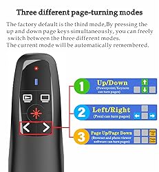 WIRELESS FUNCTIONALITY: Features reliable 2.4GHz wireless technology for seamless presentation control from up to 164 feet away(Including two AAA batteries) INTUITIVE CONTROLS: Easy-to-use buttons for forward, back, start, and end ,volume adjustment,presentation functions with tactile feedback [Plug and Play]: Simple USB receiver connection requires no software installation, The receiver has both USB-A and Type-C ports.Presentation clicker with works with desktop and laptop computers,support systems:Above Windows / Mac OS / Linux / Android/chromebook. Powerpoint clicker support software: PowerPoint, Keynote, PDF, Word, Excel, Google Slides, Prezi and etc. ERGONOMIC DESIGN: Comfortable grip and lightweight construction for extended presentation sessions PORTABLE SIZE: Compact dimensions make it easy to slip into a laptop bag or pocket for presentations on the go ,Package List: 1x presentation remote with usb receiver, 1x user manua,Two AAA batteries