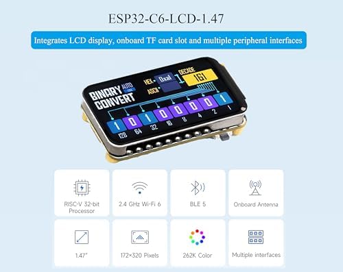 - ESP32-C6-LCD-1.47 is a microcontroller development board with 2.4GHz W-i-F--i 6 and Blue-too--th BLE 5 support, integrates 4MB Flash. Onboard 1.47inch LCD screen (172×320 resolution, 262K color) can smoothly run GUI programs such as LVGL
