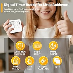 1.Count up & Countdown timer:Track cooking durations, study sessions, workouts. Countdown avoids overcooking; count up logs reading or exercise time. Perfect for daily time management. 2.Maximum Count: 99 minutes 59 seconds: handles long bakes, extended workouts, study marathons, or slow simmers. No need for resetting; covers most daily timing needs effortlessly. 3.Strong magnet: Sticks firmly to fridges, ovens, lockers. Keeps timer visible, saves space—no slipping. Perfect for kitchens, classrooms, gyms, easy to grab and use. 4.You will get: 2 x Digital Timers (upgraded version),, kids time management, classroom study, exercise, workout timing, oven baking, ideal for Christmas, birthday 5.Perfect Christmas/birthday gift: Practical for cooks, students, fitness fans. Effortless time-tracking—useful, thoughtful, fits any lifestyle.