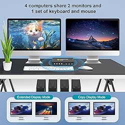 [USB3.0 KVM Switch 4 Computers 2 Monitors] This dual monitor HDMl KVM Switch 4 port supports 4computers sharing 2 monitors and USB3.0 devices. 1 set of keyboard and mouse management for 4computers, saving your desktop space and connecting work and personal computers for easy use. 2monitors can output either extended mode or copy mode. Kind reminder: Your computer needs to supportdual display function. [Equipped with 3 USB 3.0 Ports] HDMl KVM switch 2 monitors 4 computers comes with 3 UsB 3.0 ports for4 computers to share USB devices such as keyboards, mouse, printers, UsB drives, etc. This KVM switchsupports multiple signal sources, such as PCs, laptops, PS4, and more. Compatible with various computesystems such as Windows 7/8/10/Vista/xp, Linux, Mac, etc. No driver required, plug and play [UHD 4K@60Hz]This HDMl KVM switch 4 computers supports maximum resolution 4K@60Hz, compatiblewith 2K, 1080P@60Hz Or other lower resolutions. Kind reminder: Only when the signal source, monitor, andHDMl cable are supported 4K@60Hz Only then can the device output 4K@60Hz. The switch supportsadaptive EDlD. [Button Switching] The USB3.0 KVM switches supports button switching, can quickly switch to any computelat any time, making it convenient and fast, With an indicator light to remind you which computer is beingselected. [Excellent After-sales Service]The product packaging comes with 2 HDM2.0 cables, 4 USB3.0 cables, and 1USB C power cable. lt is our responsibility to ensure that every user has a great product experience andshopping experience. Therefore, if you encounter any problems during the use of this product, please do nothesitate to contact us , We will respond to your problems as quickly as possible after receiving your email.