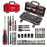 - 43Pieces Screwdriver Bit Set 19pcs-1inch(Phillips*2,Torx*15,Square*2)6pcs-2inch(Phillips*1,Torx*4,Square*1)3pcs-3inch(Phillips*2,Square*1)1pc-6inch(PH2*1)5pcs-2.6inch-socket(3/8,1/4,5/16,7/16,1/2)1pc step drill(1/8-1/2)2pcs impact bit holde(2.4inch/3inch)3pcs Impact Socket Driver(1/4,3/8,1/2)1pc Ratchet screwdriverShank: 1/4 in. hexThis Storage Tray is tailored to the space of each tool, protecting the tools and keeping them surprisingly organized Screwdriver Handle with Bit Storage The end of the ratchet screwdriver handle can store 12 screwdriver bits, just one press, the batch head pops out immediately, quick and easy. Slip-resistant grip for comfortable holding and higher torque output36 Teeth Ratcheting Screwdriver Three settings—forward, reverse, and fixed—this screwdriver allows for quick and easy switching between directionsStrong Magnetic The magnet securely holds fasteners in place, freeing your hands in tight spaces. Designed for heavy-duty impact applicationsImpact-tough bits with superior wear resistance—engineered to withstand high-torque impact drivers for maximum durability. 6-Point Design Grips on fasteners prevent corner rounding by providing precise, non-slip engagement.This hand tool for effortless mix-and-match usage, adapting seamlessly to a wide arraunctional needs, ensuring versatile solutions that integrate smoothly with any environmeny of scenarios. They are designed to cater to diverse lifestyles and ft.Heavy-duty Tool BoxNo matter how it is placed, it prevents the screw driver bits in the box from falling out. You can take all of the tools out and you get a portable tool box, it made of steel comes with a flexible handle for easier carrying various tools.