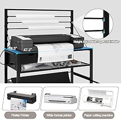 【Heavy-Duty & Sturdy Construction】This large printer workbench is built with a high-quality wooden top and reinforced steel tubes for exceptional durability. while diagonal stabilizing bars on both sides ensure rock-solid stability to securely hold wide-format printers, plotters, and large printing equipment. 【All-in-one Storage Solution】Based on real usage environment, this wide format printer workstation provides versatile organization: an adjustable paper roll holder on top, an accessory storage drawer underneath, height-adjustable shelves for printed drawings, and a pull-out fabric pouch for immediate print collection. 【Multi-Functional Work Platform】With a spacious 47.2" x 18.5" desktop, this heavy-duty tech table accommodates wide-format printers, CAD plotters, and cutting machines simultaneously, creating an efficient production station for professional workflows. 【Built-in Power Outlet】This professional drafting plotter workstation, designed with 3 AC outlets + USB charging port+ Type C port and extended 5ft power cord for flexible positioning of plotters, large format printers and auxiliary devices from any workspace location. 【Industrial-Grade Lockable Wheels】Equipped with 4 industrial 360° smooth-rolling lockable casters, This commercial wide format printer stand allows effortless repositioning of fully-loaded equipment, while maintaining stability during printing jobs.