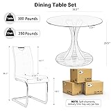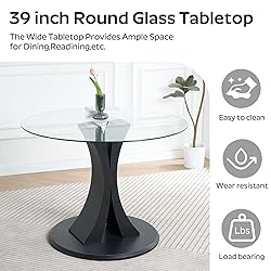 【Dining Table Set】A modern table and chair set delivering instant home upgrade. The glass top table with sturdy base and comfortable dining chairs assemble in hours – perfect for dining area, kitchen and apartment. 【Spacious 39-Inch Glass Dining Table】Features a sleek tempered glass tabletop (39-inch diameter) perfect for family gatherings. The modern round dining table offers ample space with a scratch-resistant surface, making it both stylish and practical for daily use. 【Fashionable Double C-Shaped Table Base】Supported by a sturdy MDF double C-shaped base for enhanced stability. This contemporary table base adds a sculptural touch to your dining room while preventing wobbling – ideal for durable furniture seekers. 【 Ergonomic Modern Dining Chairs】Includes comfort-cushioned PU leather chairs with ergonomic lumbar support. The mid-century style chairs feature high-resilience foam padding and angled metal legs for all-day comfort during meals or work. 【Easy-Clean & Scratch-Resistant PU Upholstery】Wipe-clean PU leather seat cushions resist spills, stains, and pet hair. These low-maintenance dining chairs combine premium faux leather with rust-proof metal frames for long-lasting elegance.