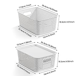 Cute and Practical: The plastic storage basket for shelves are great to fit on shelves or in drawers, use them for small items like nail polish, medicines, soaps, makeup, hair stuff, sewing essential,toothpaste/toothbrushes, spices, pencils, have them in your dresser drawer to organizer socks, under garments, these storage basket with lid provide a pratical and convenient storage solution Lightweight and Handy: The plastic storage container with lids built with handle design, easy to pull off shelf with finger handle,you can slide out the basket, take what is needed and slide it back in, the baskets with lid are light makes them easy to take down when you need something, find what you need quickly Stackable for Space Saving: The stackable design of these white storage bins maximizes space efficiency, allowing you to creat a tidy and organized storage system, with the lids included, you can protect your items from dust and moisture while ensuring they remain securely stored Sleek & Sturdy: This decorative storage boxes with lid designed in sleek white, these plastic storage container blend semlessly with any decor style, whether it's in the office, playroom, classroom, bathroom, kitchen or linen closet, great for organizing drawers and bathroom cabinets Versatile Plastic Storage Basket: The stackable storage bins with lids are perfect for your craft closet, playroom, camper pantry and refrigerator, bathroom organization, desk, dresser, art supply organization, office supplies, laundry, helping you keep your belongings neatly stored and easily accessible Note: The lids do not snap on for a tight close, just sits on top of bin for easy remove, pls check the measurements before you buy