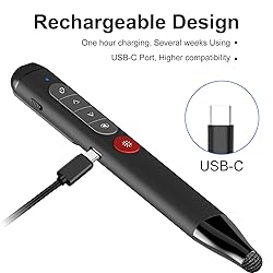 [Presentation Clicker Introduction] The slide advancer is very compact, the length is only about 13 cm, The presentation clicker has a wireless design via USB-A, supports a maximum control distance of 100 feet, and 300 feet of laser distance, allowing you to move freely around the room, and the pen clip design allows you to carry it safely and securely in your pocket. [Presentation Clicker Functions] Turn on/off switch, Marking button (Long press to activate/inactivate stylus pen marking function, single click to wipe all markings),Tab button (single click→tab/select hyperlink, double click → enter/or open hyperlink,long press → switch windows), Page up button (long press to show or exit the slide show), Page down button (long press to black the sccreen), Volume+button, Volume- button, green laser button
