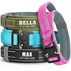 - Personalized Tactical Dog Collar with Control Handle for Large Dogs, Custom Name & Phone, Soft Waterproof Lining, Dual Reflective Strips, Optional Matching Leash Sold Separately, Heavy Duty Nylon & Metal Buckle, Pink, Blue, Black, Green.