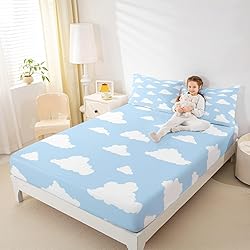 White Clouds Fitted Sheet,Cartoon Clouds Blue Sky Decor Bedding Set for Kids Teens Adults,Simple Style Graffiti Decorative Bed Cover with 2 Pillowcases(No Top Sheet),Queen Size 3 Pcs