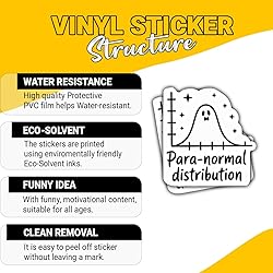 - Para-normal Distribution Sticker – Funny Math Science Statistics Ghost Graph Quote Vinyl Decal Waterproof for Laptop, Water Bottle, Notebook, Tumbler, Car – Gift for Students, Data Scientists, Nerds – 3 Inch Built to Last – Waterproof, UV-Resistant & Durable 🌟 ✅ 100% Waterproof – Designed to withstand damp, humid, and wet conditions, this sticker is perfect for water bottles, car windows, boats, and more. No peeling, no fading—just long-lasting adhesion. ✅ UV & Weather Protection – Whether exposed to sunlight, rain, or wind, this sticker stays vibrant and intact. The UV-resistant coating prevents fading, making it ideal for outdoor use. ✅ Durable & Scratch-Resistant – Made from premium vinyl, this sticker is tough enough to handle everyday wear and tear. It won’t crack, peel, or lose its shape, even in extreme conditions. ✅ Precision Die-Cut for a Clean Look – Using advanced die-cutting technology, every sticker is cut with sharp, crisp edges for a professional finish. Plus, it’s easy to trim or modify for a perfect fit. ✅ Versatile for Any Surface – Whether decorating your laptop, car, tumbler, skateboard, or phone case, this sticker sticks securely to both indoor and outdoor surfaces while maintaining its bold design. ✅ Easy to Apply & Remove – No tools, no hassle—just peel and stick on any smooth surface. When it’s time to remove, it comes off cleanly without leaving sticky residue. 📌 Built for durability, designed for style—this sticker is ready for anything! 🚀