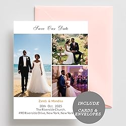 - Size: The Save the Date cards for your wedding are available in two different sizes - 5x7 inch or 4x6 inch 15 to 200 cards Personalization: Professionally customized, the cards come printed with all the details - 1 or 3 Photos, names, date, location and additional information. You can have them personalized even for one person celebration or milestone by changing the text of the invitations Materials: Printed on 18PT CARDSTOCK - Crafted on premium 350gsm smooth cardstock, these save the dates also offer 5 envelope colors to select Design: Created as a modern minimalistic invitations, these save the dates cards blend graciously with your choice of real foil to create a luxury yet simple and classic invitation. The bold "Save the Date" highlights the special occasion Perfect to use as Multifunctional Party invitations card for: Wedding invitation, Baptism, Birthday Party, Anniversary, New Year and other special occasions. Add your own photo underneath and create your own DIY Save the dates