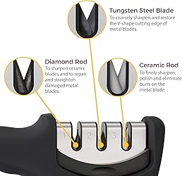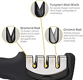 VERSATILE DESIGN: Professional kitchen knife sharpener suitable for various types of knives including chef, kitchen, and utility knives SHARPENING SYSTEM: Multi-stage sharpening process helps restore and maintain blade edges for optimal cutting performance ERGONOMIC GRIP: Non-slip handle provides secure and comfortable control during sharpening process COMPACT SIZE: Space-saving design makes it easy to store in kitchen drawers or cabinets when not in use DURABLE CONSTRUCTION: Built with quality materials to ensure long-lasting performance and reliable knife maintenance