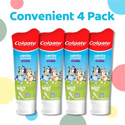 Colgate Kids Bluey Toothpaste with Fluoride for Cavity Protection, Ages 2+, ADA Accepted, Sugar Free and Gluten Free, Bubble Fruit Flavor, 4 Pack, 4.6 Oz Tubes