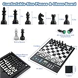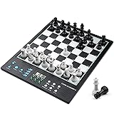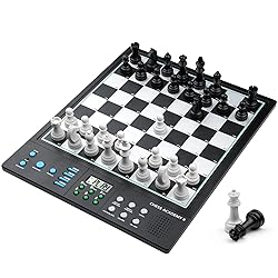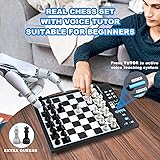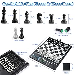 Electronic Chess Board for Adults: Comfortable size chess pieces, King height 2.36-inch, 10.5x10.5-inch chessboard with a 14.6 inches in diagonal for a wider playing field for better move planning and piece maneuvering. Enjoy a perfect and immersive chess moment! Computer Chess Set for Skill Level Up: Powered by a built-in chess engine with an ELO rating over 2200, offering challenges for beginners to masters. Quick computer' move without waiting. Adjustable difficulty levels ensure a tailored experience. Electronic Chess Set for Kids: Well designed Staunton-style chess pieces set, making it easier for children to distinguish between the pieces, ensure easy recognition and a touch of elegance. Extra queens for pawn promotion. Computer Chess Game with High-Sensitivity Chessboard Design: Effortlessly register your moves with a simple press on the high-sensitivity chessboard squares. Perfect for quick gameplay. Smart Talking Chess Board: AI voice tutor for chess teaching and learning, enhance your chess skills with our built-in AI voice tutor that analyzes and guides your moves in real-time, allows you to experiment, learn from mistakes, threats, and refine your strategies. Chess Electronic with learning features: Unlimited TAKE BACK until start position, swap sides with computer, get hint move from computer, Voice assistant for legal move announcement, set up chess problem and verify correct pieces position. Built-in 256 classic game records – come from the legendary matches of esteemed chess masters, including Paul Morphy, Garry Kasparov, and others. follow along with masters to replay their matches and absorb their strategic insights and chess wisdom. Built-in 128 endgame puzzles – 5 key tactical types: from Mate-in-1 to Mate-in-4 and win materials. perfect for beginners to grasp foundational chess tactics and strategies. puzzle diagrams book included for easy setup and practice Strong magnetic Chess Set for Kids: Pieces stay firmly in place - no wobbling or sliding! Quiet felt-padded bases reduce noise, yet are easy to lift and move - ideal for playing even on the go, such as in cars or trains. Portable & Durable Design for On-the-Go Play: Powered by 4 AA batteries with auto-power off and low-battery alerts, our chess set is designed for long-lasting gameplay. Includes EVA foam chess pieces storage for easy portability and protection.