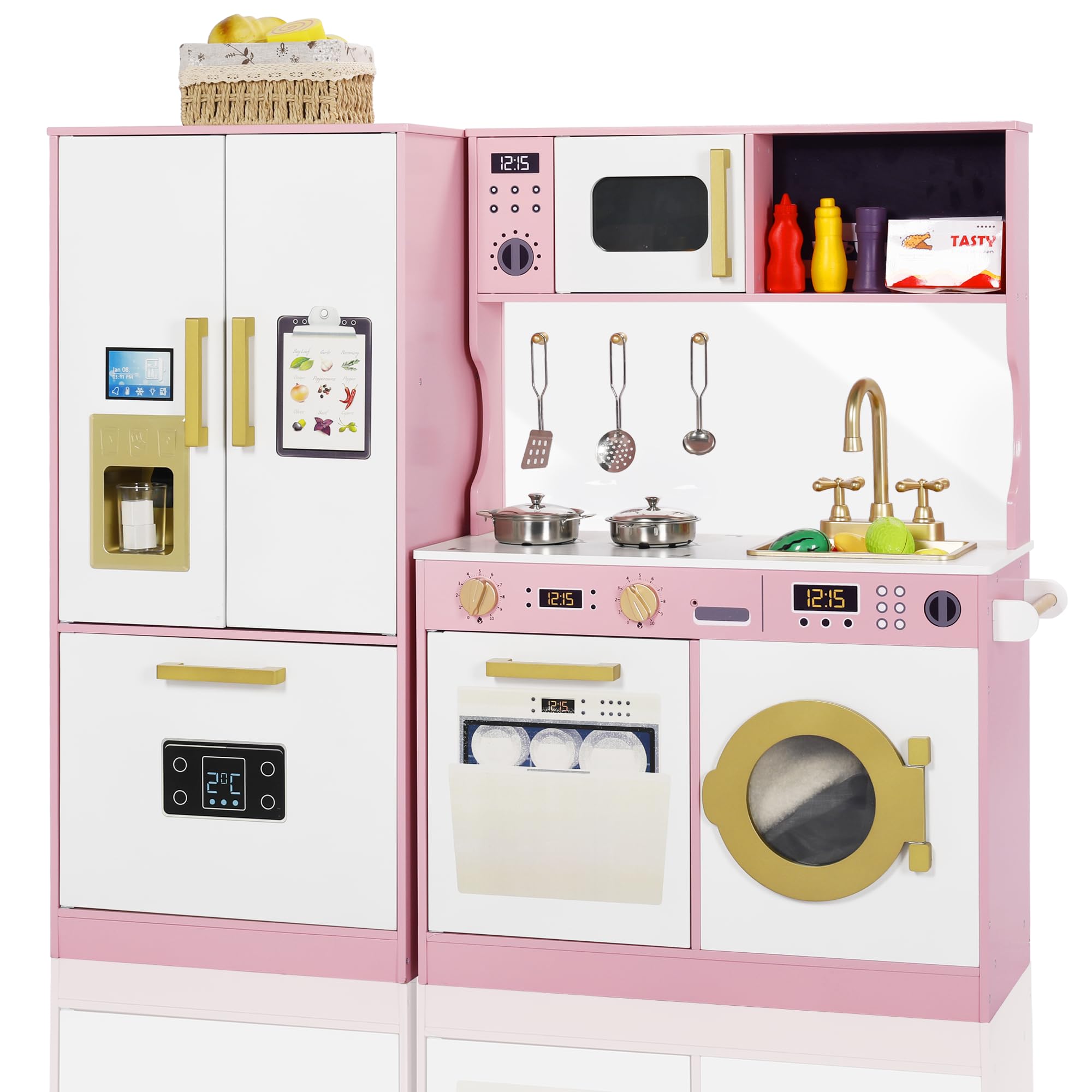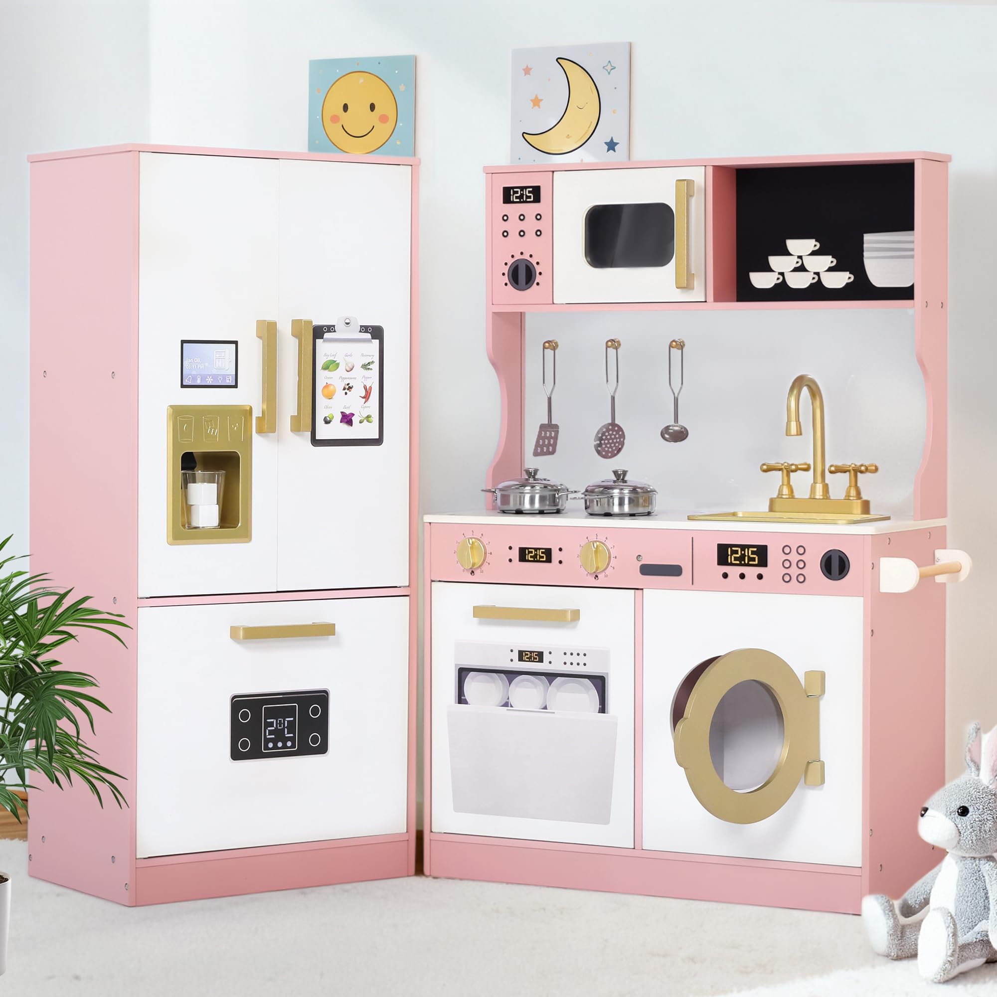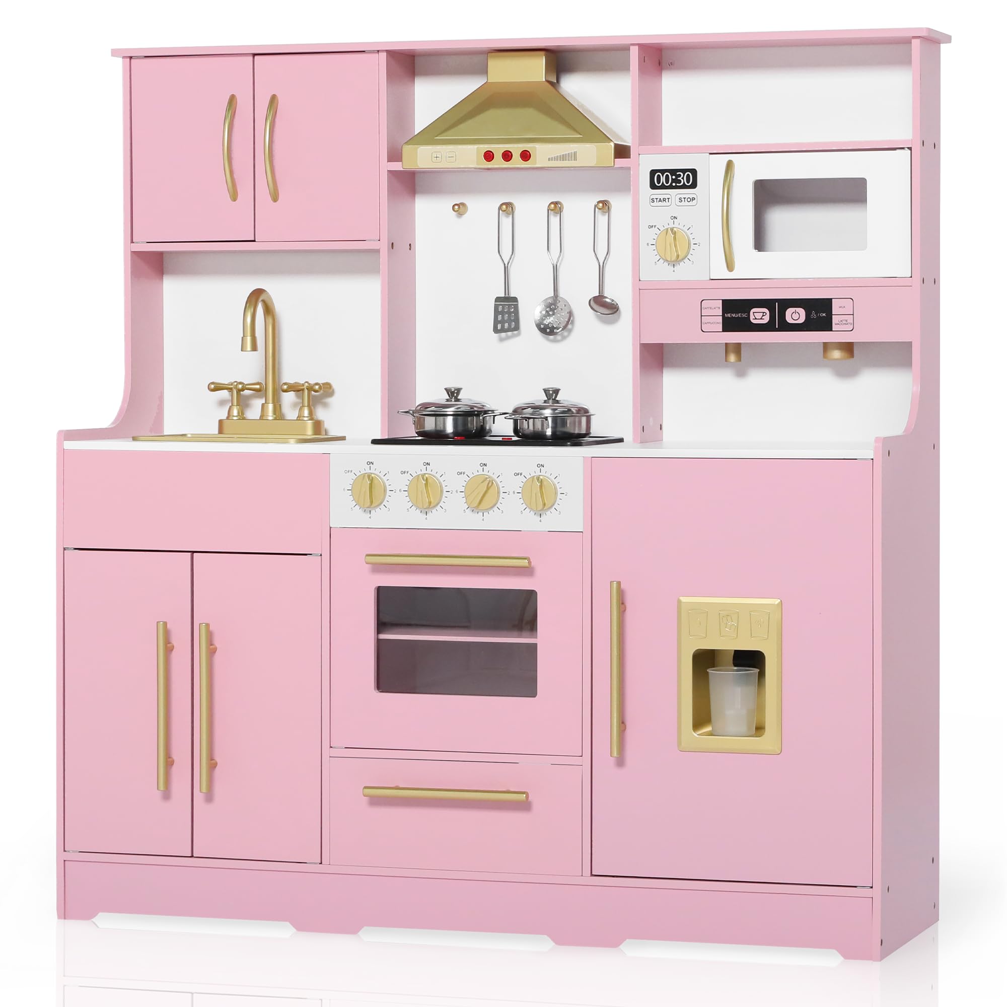 Pink Wooden Play Kitchen with Realistic Features & Accessories, Pretend Cooking Toy for Kids 3+, Ideal Gift for Toddler Boy and Girls