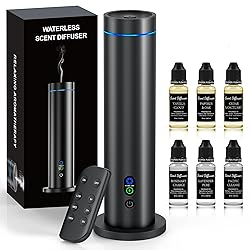 【Pure Waterless Diffusion】Experience a refined way to scent your space with waterless cold-air diffusion. This advanced waterless diffuser transforms pure essential oils into an ultra-fine aromatic mist that gently fills the room with a smooth, balanced aroma — not heavy humidifier fog. No water, heat or dilution is needed, so every drop delivers clean, long-lasting fragrance without moisture or residue. Includes 6 premium oils, making it a complete waterless diffuser starter kit. 【Whole-Room Scent】Built with a matte aluminum alloy body, this essential oil diffuser pairs modern elegance with everyday durability. Designed to scent spaces of up to 1000 sq. ft. in open layouts, it’s ideal for living rooms, home offices and spa-inspired interiors. Coverage refers to overall scent reach over time and may vary based on room layout. Fragrance travels naturally through the air to create an inviting, evenly balanced atmosphere. 【Quiet Glow Mode】With ultra-quiet operation under 38 dB, this oil diffuser for home blends seamlessly into bedrooms, workspaces or relaxation zones. The soft 7-colour ambient light adds a warm visual accent, helping transform any room into a calm, welcoming retreat. 【Smart Timers & Controls】Adjust scent intensity across Low, Medium or High modes and choose from 1, 4 or 8 hours, or Continuous Mode (no time limit displayed). Fragrance is released at the same gentle rhythm to maintain a consistent, balanced ambience. The included remote and memory function restore your preferred settings automatically, giving you consistent fragrance without daily adjustment (plug-in design; no built-in battery). 【Thoughtfully Designed Safety】Engineered with a reinforced base and intelligent tilt sensor, this diffuser oil machine automatically stops if tipped, helping prevent spills and accidents. Safe, stable and dependable, it’s designed for homes with children, pets and modern lifestyles in mind.