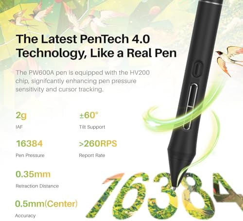 • Pixel-Perfect Pen Precision: The battery-free PW600A with Pentech 4.0 offers 16,384 pressure levels and 5080 LPI resolution for capturing the finest details and most nuanced strokes.With three side keys and a dust-proof grip, it not only provides a real pen-like experience but also boosts effciency.
