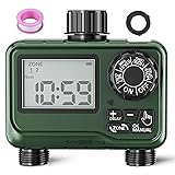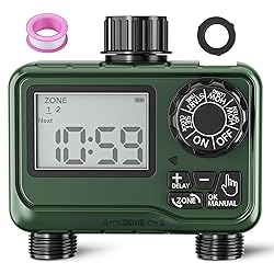 【Dual-Zone Independent Programming Control】This sprinkler timer has two independent outlets, each zone can be independently programmed, and watering time, frequency and duration can be customized. It can effectively meet different water needs, ensuring uniform watering and optimal moisturizing effect. 【Simple Watering Setup】Supports both 12/24-hour formats, with automatic watering duration ranging from 1 minute to 12 hours and customize the frequency from every 1 to 12 hours, or 1 to 7 days.And manual watering options. Whether you need short-term watering or long-term irrigation, this timer has you covered. Its IP54 waterproof rating ensures durability in various outdoor conditions. 【Rain Delay Function for Smart Water Saving】Built-in rain‑delay pauses irrigation for 24, 48, or 72 hours based on weather, conserving water and protecting plants from overwatering.Whether it's light rain or heavy downpours, the system will resume watering at the right time. 【Large LCD Display for Easy Operation】The oversized LCD display clearly shows the date, time, day of the week, and watering settings, making it easy to navigate. Setting up automatic watering schedules or manual watering is quick and hassle-free. 【Wide Compatibility and Easy Installation】Compatible with standard 3/4-inch hose threads (garden hose, lawn, greenhouse), powered by 2 AAA batteries included, no sockets or wiring required. Contains sealing gaskets to prevent leaks, and meets IP54 dust and weatherproof rating. 2-year warranty, reliable performance.