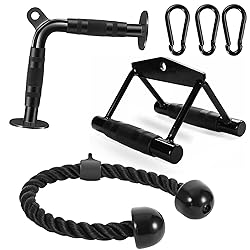💪【Lat Pulldown Attachments Set】: Includes: 1x Double D Handle, 1x V-Shaped Bar,1x Tricep Rope and 3x Snap Hooks . These home gym accessories for men and women are designed to fit most cable systems. 💪【With Grip Lat Pull Down Bar】:Our rubber handle with efficient Grip design on both sides has a balanced curvature that creates feeling of solid grip, prevent slipping during workout even with sweaty hands.It can better exercise your grip, shoulders, and back. 💪【TOP PROCESS & MATERIALS 】- Cable machine attachment constructed of high-quality solid steel with polished chrome finish. 0.6 inch hole can fit easily for all cable system. Textured rubber coating handle,provides ergonomic & secured grip during workout, provides a balanced force to both arms when attach it to any gym machine. 💪【MULTI WORKOUTS】-Tricep pull down attachment perfect for building stronger triceps and grip strength, assisting muscles around elbows, wrists, back, abs and shoulders with different compound pushing exercises: triceps pushdowns, seated cable rows, straight bar cable pressdown, seated upright rows, perfect for both workout at home and gym. 💪【ALL LEVEL APPLIED】: LAT Pull Down Attachment can be used for all gym levels, from beginner to professional,this exercise equipment will help you focus on the target muscle groups rather than putting unnecessary stress on the joints.If any questions, our order support the all-the-way tracking service on amazon. We guarantee fast customer service and only wish our customers satisfaction.