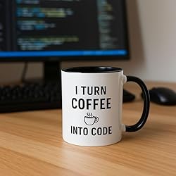 DESIGN FEATURES: Classic white ceramic mug with black interior and handle, featuring bold 'I Turn Coffee Into Code' text with coffee cup icon PERFECT FOR: Ideal gift for programmers, software developers, and coding enthusiasts who appreciate both coffee and technology CAPACITY: Standard 11-ounce size perfect for your daily coffee, tea, or favorite hot beverage while coding CONSTRUCTION: Made from durable ceramic material that's microwave-safe and dishwasher-safe for easy cleaning WORKSPACE READY: Professional appearance suitable for office use, with contrasting black and white design that matches modern desk setups