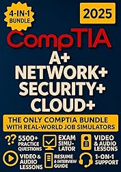- COMPLETELY UPDATED MID-JULY 2025!Are You Tired of Studying for a Certification, Only to Feel Unprepared for the Actual Job?You’re staring at a wall of acronyms—TCP/IP, SIEM, VLANs—and it feels like learning a foreign language. You’ve bounced between a dozen YouTube channels, half-finished online courses, and outdated prep guides, but nothing seems to stick.Maybe you’re worried you’ll pass the exam but freeze in an interview the moment they ask about real-world scenarios. Or perhaps you’ve tried before and failed, leaving you frustrated and questioning if you have what it takes.Let’s be honest. In 2025, a paper certificate isn't enough. Employers don't just want certified candidates; they want confident, capable professionals with hands-on skills.What if you could stop memorizing and start understanding? What if you could get certified and simultaneously build the real-world skills and confidence to walk into any interview and land the job?That’s why we didn’t just write another book. We built the only 4-in-1 CompTIA Career System designed to make you not just certified, but job-ready.Unlock Your All-Access Pass to the Job-Ready PlatformYour purchase unlocks lifetime access to our exclusive e-learning platform, a comprehensive digital ecosystem where your new career truly begins. This isn't just bonus material, it's the core of your success.Here’s what you get inside:Stop worrying if you're ready. Our Exam Simulator is a powerhouse of practice, featuring:A massive bank of 6,000+ practice questions (1,500+ for each certification).15+ Full-Length Timed Practice Exams (for each certification) to perfectly replicate the pressure and pacing of test day.Step-by-Step Explanations for Every Single Question, so you learn the "why" behind every answer.✅ THE REAL-WORLD JOB SIMULATORThis is our game-changer, designed to close the "experience gap." Don't just learn theory, apply it. Troubleshoot network issues, configure security protocols, and deploy cloud resources in simulated environments that mirror the challenges you'll face on day one of your new job.✅ THE COMPLETE CAREER ACCELERATOR TOOLKITWe take you beyond certification and into the hiring process with:Proven Résumé Templates designed to get past HR filters.An Expert Interview Guide with common questions and winning answers.1-on-1 Support: Stuck on a tough concept? Reach out to our team for personalized help.Whether you're at your desk or on the go, we have you covered with:Engaging Video & Audio Lessons to complement the text, perfect for auditory and visual learners. This All-in-One System Covers Four Crucial Certifications:📘 CompTIA A+ (220-1101/1102): Master hardware, operating systems, and troubleshooting from the ground up.🌐 Network+ (N10-009): Understand how networks function with clear, real-world examples.🔐 Security+ (SY0-701): Become fluent in cybersecurity, threats, and risk management.☁️ CompTIA Cloud+ (CV0-003): Master vendor-neutral cloud computing. Deploy, secure, and manage cloud infrastructure with confidence, from migration to maintenance. Imagine walking into your exams with unshakeable confidence.Imagine discussing technical scenarios in an interview with the authority of someone who's already done it.Imagine getting that "You're hired" email.You’re not bad at tech. You’ve just never had it explained this clearly or been given the tools to truly practice.Don't wait another day to build the IT career you deserve. Scroll up and click the "Buy Now" button to unlock your all-access pass.