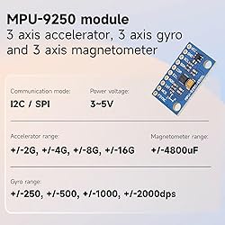 The gyroscope features a monolithic design and compact form factor, enabling the integration of an accelerometer, gyroscope, and 3-axis magnetometer within a miniature 3mm×3mm QFN package. And the Sensor uses immersion gold PCB and machine welding technology to ensure quality The sensor module enables precision tracking across dynamic motion profiles by supporting user-programmable full-scale ranges: ±250/500/1000/2000°/sec (dps) for the gyroscope, ±2/4/8/16g for the accelerometer, and ±4800µT for the magnetometer Other industry-leading features include programmable digital filters, a precision clock with 1% drift from -40°C to 85°C, an embedded temperature sensor, and programmable interrupts. Compatiable for Arduino, ESP8285, Raspberry Pi( Note: Rasperry Pi requires special wiring, please connect the EDA pin to the SDA pin and the ECL pin to the SCL pin if you have some problem on it) The device supports full register access via standard I2C (400 kHz) or SPI (up to 1 MHz) interfaces. For bandwidth-critical applications, time-sensitive sensor data and interrupt status registers can be directly retrieved through high-speed SPI burst mode operations at 20 MHz Chip used: MPU-6500; Power supply: 3-5v (internal low voltage dropout regulator); Communication method: standard IIC/SPI communication protocol; Chip built-in 16bit AD converter, 16-bit data output; Gyroscope range: ±250 500 1000 2000 °/s; Acceleration range: ±2±4±8±16g