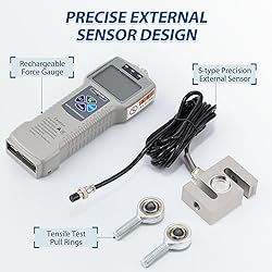 【PRECISE EXTERNAL SENSOR DESIGN】 Engineered for heavy-duty applications, the DS2-5000N features a separate high-precision sensor, maximizing flexibility for compression, tension, and destructive testing setups without straining the main unit. Capacity: 5000N / 500kg / 1124lbf. 【HIGH ACCURACY & DUAL PEAK MODES】 Achieve reliable results with ±0.5% full-scale accuracy. Capture maximum force with Peak Hold Mode or monitor real-time changes with Tracking Mode. Perfect for fracture tests, quality checks, and spring testing. 【EFFORTLESS DATA MANAGEMENT】 Record up to 999 measurements internally. Use the included USB cable to connect to a PC (Windows compatible software on CD) for deep analysis, reporting, and long-term data logging, streamlining your QC process. 【USER-CENTRIC & DURABLE】 Features a large reverse LCD display, unit conversion (N/kgf/lbf), overload warning (120% F.S.), auto power-off, and a sturdy metal housing. 【COMPLETE KIT READY TO USE】 Get started immediately. Package includes: DS2-5000N Main Unit, External Sensor, Tensile Test Pull Rings, AC Charger, USB Cable, RS232 Cable, Software CD, Manual, and a Protective Case. A versatile tool for engineers, labs, manufacturers, and R&D departments.