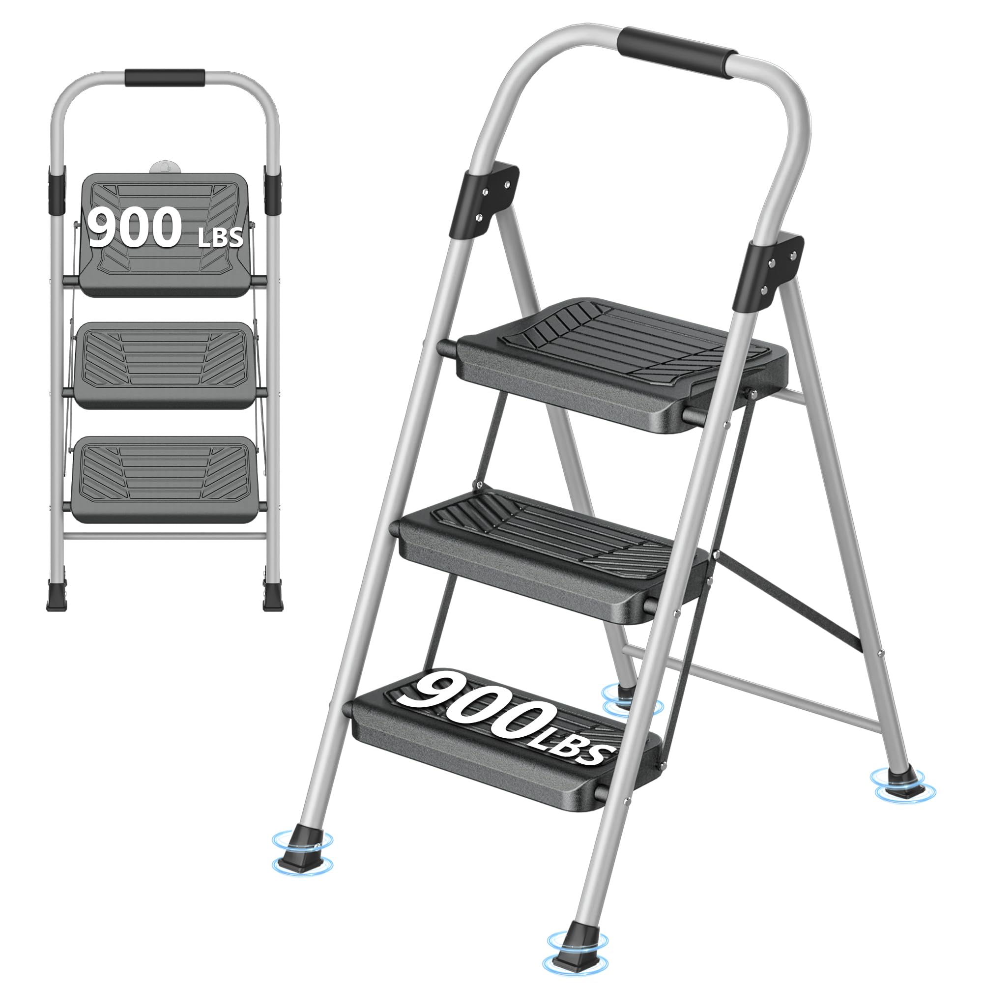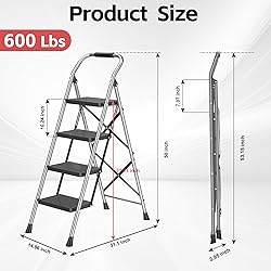 Heavy-Duty Performance and Durability - 4 step stool ladder that's built to last, with the capacity to hold up to 600 pounds , is ideal for heavy-duty use. Crafted from thickened 9mm Alloy Steel, these ladders are resistant to wear, corrosion, rust, and temperature extremes, ensuring long-lasting performance and durability. They are perfect for ladders for home and step stools for adults, providing a reliable solution for all your height-related needs. Enhanced Safety and Stability - Featuring a high-strength steel frame and gravity lock system, our step ladders offer robust support that engages securely for your peace of mind. With Dual-Sided Reinforcing Ribs, Our ladders provide a sturdy and reliable climbing experience, ensuring stability and reliability in every use. This makes them ideal for kitchen step stools for adults and stepping stool for adults, offering a safe and secure option for reaching high places. Non-Slip Ergonomics for Confident Use - Our ladders are designed with wide, non-slip iron treads for heel-to-toe support and sponge-covered handrails for a firm, comfortable grip that gives you confidence when climbing the ladder. Our ladders come with large rubber feet that grip the ground securely to prevent movement and scratches to the floor. The unique curved design gives more leg room and protects your legs from knocks. Ultra-Portable and Space-Efficient Design - Folding down to an astonishingly slim profile of just 2.95", our step stool ladders are the perfect space-savers for your home. Ideal for storage in closets, under beds, or behind doors, our fully assembled ladders are ready to use out of the box, saving you time and effort. This makes them the ultimate foldable step stool and ladder for home use. Versatile Functionality and Aesthetic Appeal - Transform your space with our ladders that double as beautiful plant stands or elegant storage solutions when not in use. Modern design blends seamlessly with your home decor, making them an aesthetically pleasing addition to your home, kitchen, Step stools and stepping stools that can be used in various settings.