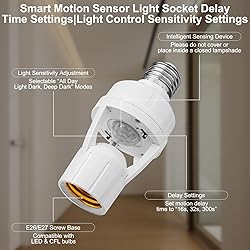 Smart Motion Detection: The motion sensor light socket automatically turns the light on when motion is detected and off after a delay, providing an energy-saving, hands-free lighting solution. Perfect for areas like hallways, garages, and warehouses where lighting is needed without constant manual operation Easy Plug-and-Play Installation: Simply screw into a standard E26/E27 socket without any wiring modifications. This screw-in motion sensor light socket is compatible with various bulbs, including LED and energy-efficient options, with a max power of 60W (30W for halogen lights). Voltage: AC 100V-240V. Hands-Free Lighting: Automatically illuminates when you return home or carry items. Ideal for entrances, courtyards, and storage areas where automatic lighting is needed. The motion sensor socket with high-sensitivity ensures accurate detection, saving energy by preventing lights from being left on Energy-Efficient and Eco-Friendly: Smart light sensor socket technology helps minimize electricity waste, ensuring the light only turns on when needed. Reduces power consumption and contributes to an eco-friendly, more efficient lifestyle Selectable Light Modes: Choose from "Dark Mode" for complete darkness, "Dusk Mode" for low-light conditions, or "All Day Mode" for 24/7 motion detection. Perfect for environments like garages, warehouses, or areas without natural light, using the light socket motion sensor adapter Customizable Delay Settings: Adjust the light-off delay according to your needs. Choose from 16 seconds (quick pass-through), 36 seconds (daily use), or 300 seconds (for areas requiring continuous lighting, like workspaces), all controlled by the motion sensor light socket Quality Assurance: This product has a 5% factory defect rate, which is typical in the industry. If the light sensor socket doesn’t work as expected, contact us for a replacement. The light will perform a self-test upon initial power-up to ensure proper function Safety Caution: For safety, do not use bulbs exceeding 60W to avoid damaging the device or causing hazards. High-heat bulbs like halogen should not exceed 30W. Always ensure correct installation of the light socket motion sensor adapter for optimal performance