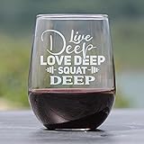 - This 17oz hand-engraved stemless wine glass features the motivational phrase "Live Deep Love Deep Squat Deep". Perfect for fitness enthusiasts and weightlifters, this etched wine glass makes a unique and thoughtful gift. Enjoy your favorite wine while staying inspired to reach your fitness goals. Ideal for birthdays, celebrations, or as a special treat for yourself. The meticulous engraving ensures lasting quality and elegant style.GIVE THE GIFT OF A SMILE — IN STYLE! The best gifts are both meaningful and practical — exactly what makes this premium 17oz stemless wine glass a standout choice.. Crafted from BPA free and lead free glass and hand-engraved in Colorado, USA, each glass features a permanent etched design that wonâ€t fade like printed ones — ensuring your thoughtful message lasts a lifetime. Its generous 17oz size is slightly larger than the standard, adding both elegance and functionality for wine lovers and casual sippers alike. Plus the hand etched design is extremely smooth providing a quality hand feel that you'll appreciate. Individually gift-boxed for safe delivery and a polished presentation, this glass is as giftable as it is durable. Dishwasher safe and built for everyday enjoyment, itâ€s the perfect way to celebrate special moments with style. GET YOUR 17oz STEMLESS WINE GLASS TODAY!!!!