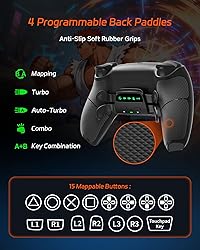 Immersive native experience: Built from original PS5 DualSense controllers; retains haptic feedback and Bluetooth; fully compatible with PlayStation 5 and PC; keeps official ergonomics and performance 4 Programmable back paddles: Support Mapping, Turbo, Auto-Turbo, Combo, and Key Combination functions for flexible customization and smoother control; ergonomic layout ensures intuitive access Upgraded joystick module: TMR Electromagnetic Joystick deliver superior anti-drift performance over Hall effect; Includes 3 pairs of swappable caps (concave/domed/tall); Tool-free replacement adapts to different grip styles Extended Playtime: Powered by a 2100mAh battery for up to 11 hours of wireless gaming; the anti-slip soft rubber back grip improves stability and reduces hand fatigue during gameplay Complete refresh configuration: Custom shell with UV scratch-resistant coating combines great feel and style; includes USB-C cable and storage bag, supporting wired mode and easy portability for a full gaming experience
