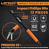 13-Pack Impact Phillips Bits Set, LATTOOK #1, #2, #3 Magnetic Anti Slip Long Phillips Screwdriver Bits Set, 1/4" Hex Shank S2 Steel, Ph1, Ph2, Ph3