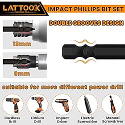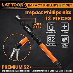 DURABLE MATERIALS: LATTOOK adopts high-quality S2 alloy steel material with our special heat-treatment technology ,which offers exceptional wear resistance, impact resistance, and hardness, enhancing the strength of bits.Manganese black phosphate surface to prevent rust even in the rain ANTI-SLIP DESIGN: The head of Phillips bits which is anti-slip design, rough surface increases friction with the screw head and reducing slippage, Ideal for prolonged use, especially in high-torque tightening or loosening operations FULL SIZES PHILLIPS BITS: 12 Professional-Grade #1 #2 #3 Phillips bits in different lengths: 1 "(PH1, PH2, PH3)- 3PCS, 3 "(PH1, PH2, PH3)- 3PCS, 4 "(PH1, PH2, PH3)- 3PCS, 6"(PH1, PH2, PH3)- 3PCS, 3'' bit extension-1PC; Each drill bit is labeled with its size DOUBLE GROOVES: 1/4'' Hex shank which it's double grooves design, can be used for more drill tools, such as cordless drill, lithium drill, electric screwdriver, manual screwdriver, etc WIDELY APPLICATIONS: Impact Phillips bit set used in automobiles, repairs, trucks, automobiles, engines, motorcycles, interiors, dashboards, computers, cable boxes, toys and appliances. Magnetic bits make it easy to lock and remove screws, do not decay magnetic after multiple uses, ensuring extraordinary