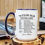 - Celebrate turning 79 with humor and warmth! This ceramic coffee mug features a playful 'Texting Code' design that will bring a smile to anyone's face. Available in 11oz and 15oz sizes, it’s perfect for enjoying a favorite brew. Microwave and dishwasher safe, this mug is as practical as it is entertaining. The fade-resistant print ensures that the laughter lasts, making it an ideal gift for birthdays, anniversaries, or just because.